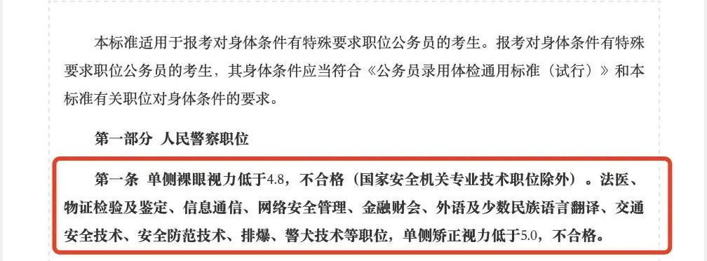 法医、物证鉴定、网络安全等职位:单侧矫正视力低于5.0,不合格。